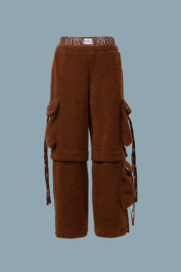Pantaloni cargo unisex realizzato in eco pelliccia , con maxi tasche laterali e lacci in tessuto di cotone stampato Bandana.
