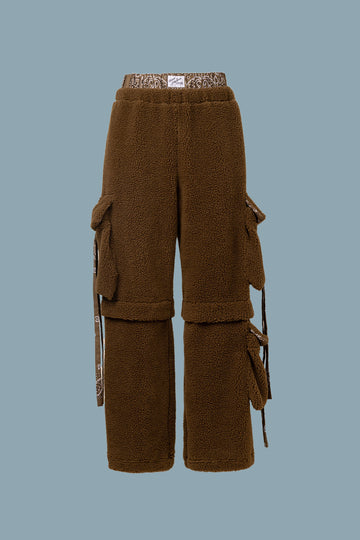 Pantaloni cargo unisex realizzato in eco pelliccia , con maxi tasche laterali e lacci in tessuto di cotone stampato Bandana.