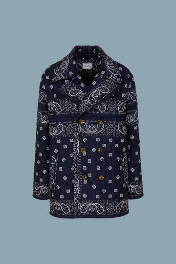 Peacoat doppiopetto stampa Bandana, in cotone 100% realizzata unendo insieme foulard bandana trapuntati con ovatta 100 gr riciclata , foderato con nylon antivento anch’esso trapuntato con 100 gr di ovatta riciclata.