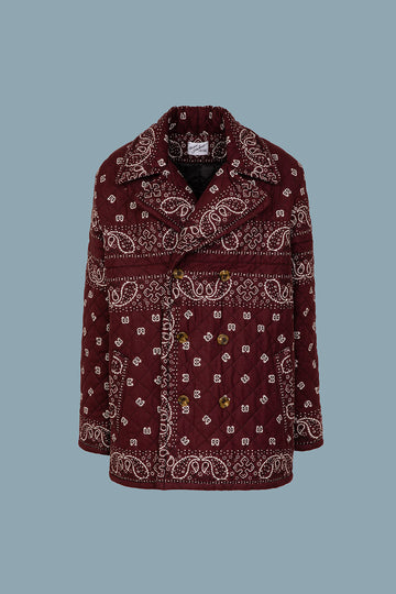Peacoat doppiopetto stampa Bandana, in cotone 100% realizzata unendo insieme foulard bandana trapuntati con ovatta 100 gr riciclata , foderato con nylon antivento anch’esso trapuntato con 100 gr di ovatta riciclata.