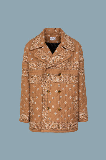 Peacoat doppiopetto stampa Bandana, in cotone 100% realizzata unendo insieme foulard bandana trapuntati con ovatta 100 gr riciclata , foderato con nylon antivento anch’esso trapuntato con 100 gr di ovatta riciclata.