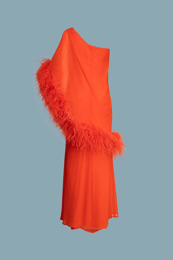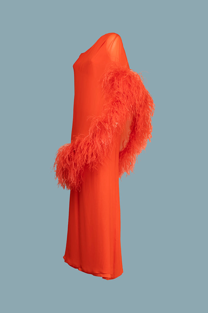 Abito in georgette di seta 100% e piume di struzzo ,interamente prodotto in Italia , è una creazione esclusiva Madame Pauline Vintage .