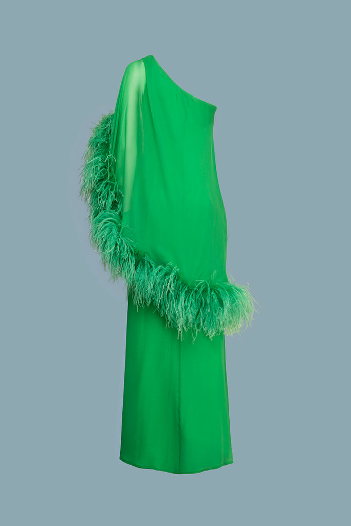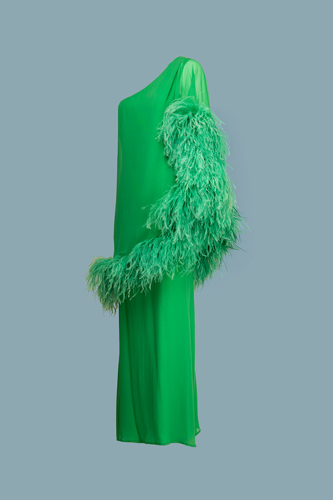 Abito in georgette di seta 100% e piume di struzzo ,interamente prodotto in Italia , è una creazione esclusiva Madame Pauline Vintage .