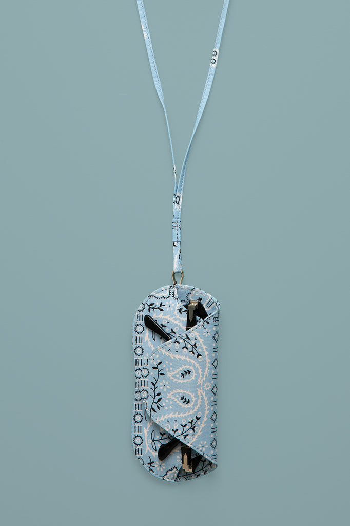 la forma si adatta a contenere qualsiasi modello di occhiali , il laccio può essere indossato al collo o annodato sul manico di una borsa , il pratico moschettone consente di togliere il lacciò e utilizzarlo appeso al passante del pantalone o molto più semplicemente dentro una borsa.
