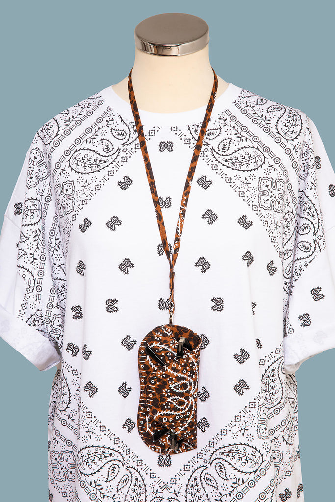 la forma si adatta a contenere qualsiasi modello di occhiali , il laccio può essere indossato al collo o annodato sul manico di una borsa , il pratico moschettone consente di togliere il lacciò e utilizzarlo appeso al passante del pantalone o molto più semplicemente dentro una borsa.