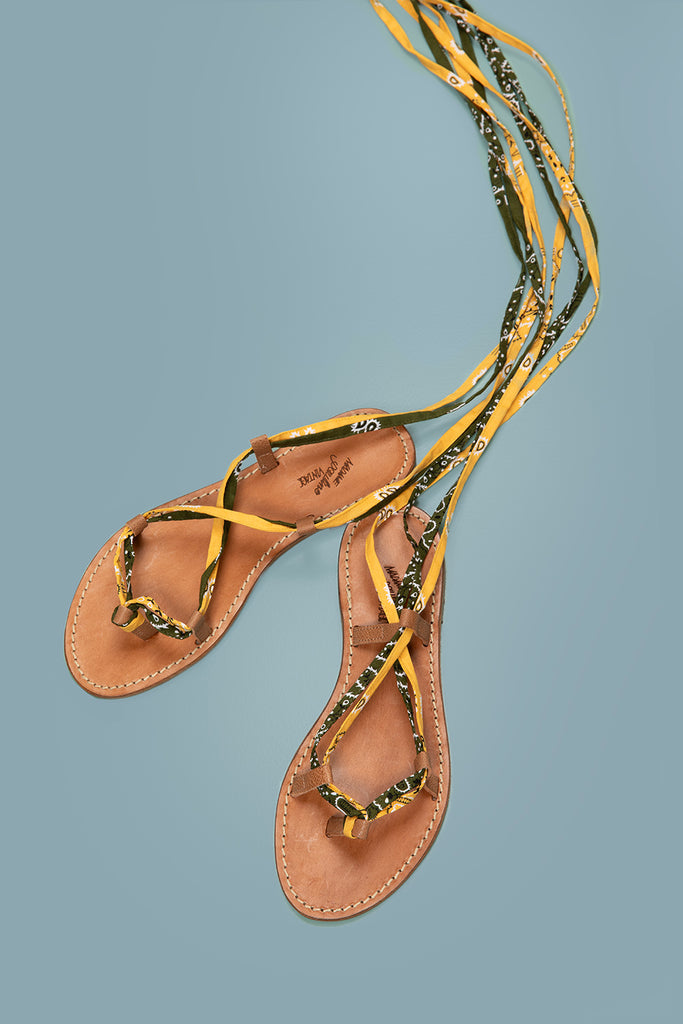 I sandali Capresi in cuoio si vestono di Bandana, realizzati in cuoio a tintura vegetale e nastro in cotone 100% sono una produzione esclusiva Madame Pauline Vintage.
